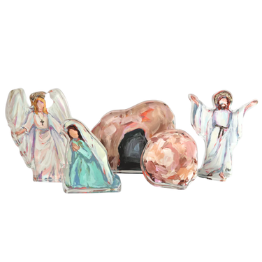 Celebrate Jesus' resurrection story with this unique acrylic resurrection set! This beautiful set showcasing Lauren's original artwork is crafted of 1/2" thick acrylic and features Jesus, Mary, the angel, the tomb and it's stone.