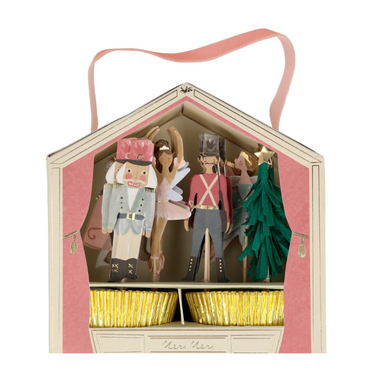 Make your cupcakes look super special this Christmas with this Nutcracker kit. The topper designs include Nutcracker characters and a green fringed crepe paper Christmas tree, with gold foil star on top. It also includes 24 gold foil cupcake cases for a really stylish effect. The kit is beautifully presented in a box with a pink velvet ribbon handle, so makes a fabulous gift too!