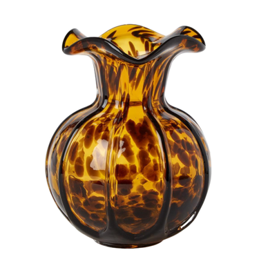 Indulge in the whimsical charm of this handcrafted Ruffled Tortoise Print Vase. Each piece uniquely showcases the beauty of glass artistry, with a color variation reminiscent of a tortoise shell. This exquisite vase is a versatile centerpiece, perfect for displaying vibrant floral arrangements or standing elegantly on its own.