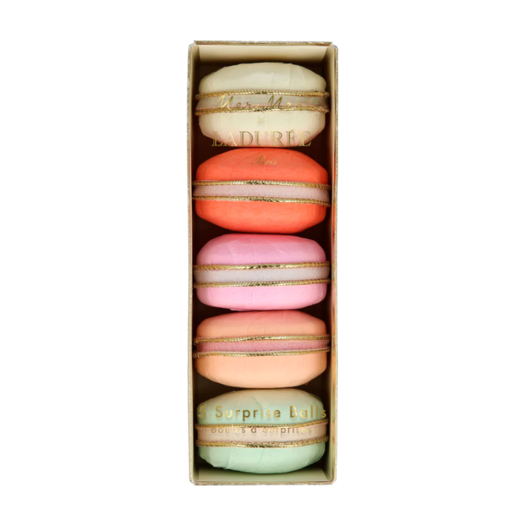 We're delighted to collaborate with Laduree, the restaurant, tea room and macaron specialist, to create these wonderful surprise balls. They are beautifully crafted to look like colorful macarons, and when opened reveal a host of delightful gifts.