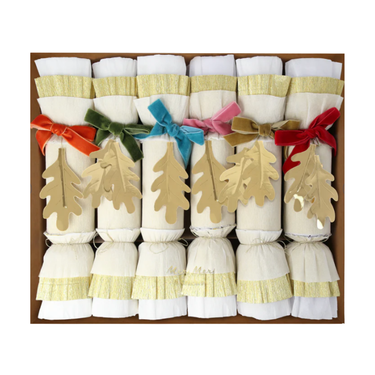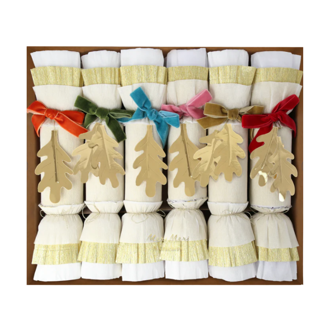 Soft velvet bows, golden leaves and layers of crepe paper – these crackers are super luxurious! Guaranteed to make your Thanksgiving, or any fall celebration, look amazing. Not only will they add a shimmering touch to your party table, but the superb contents will definitely delight your guests. Each contains a party hat, joke and a wooden leaf keyring or brooch.