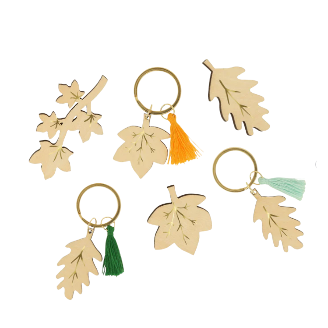 - The gold tone keyrings each feature a plywood leaf with shiny gold foil details and a tassle in orange, mint or green - the leaf and tassels are attached to the keyring with a gold tone jump ring